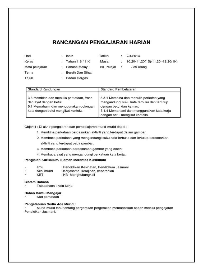 Contoh Rph Bahasa Melayu Tahun 1 Semakan 2017